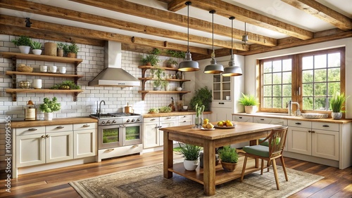 Farmhouse-style kitchen with rustic wooden beams and ceramic decor