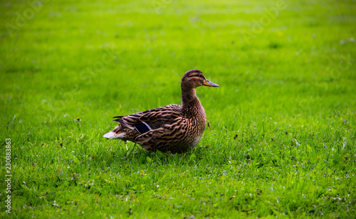 Farming, agriculture, nature concept. The duck sits on the green grass on a summer day. Green grass background, close-up. Funny duck.