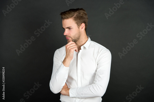 Fashion barber. Serious man touch beard dark background. Beard barber. Handsome guy with unshaven face. Mens grooming. Skincare and haircare. Barber shop. Barber services. Barbershop and hair salon