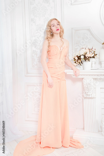 Fashion Beauty Portrait. Beautiful Blonde Girl, Model Woman wearing Long evening prom Chiffon dress. Studio retouched shot