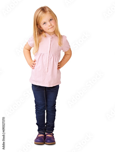 Fashion, cute and portrait of child in studio with stylish, cool and trendy outfit for kids. Happy, sweet and full body of young girl model with casual style and positive attitude by white background