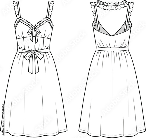 Fashion flat sketch of sleeveless ruffle dress, front and back view, bow detail, feminine design, CAD template, vector outline
