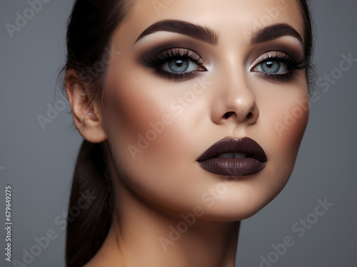 Fashion style, manicure, cosmetics and make-up. Dark lips makeup & nails polish. Close-up portrait of female model with brown lipstick, black fingernails and clean skin. Shiny slicked back hairstyle