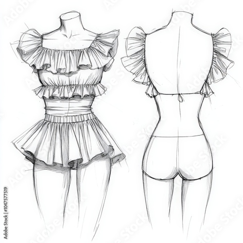 Fashion Technical Sketch - Ruffle Trim Top with Modern Outline and Subscribing Seam Details