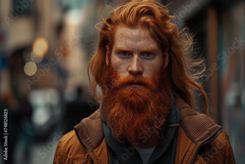 Fashionable hipster with red hair and beard living on the street