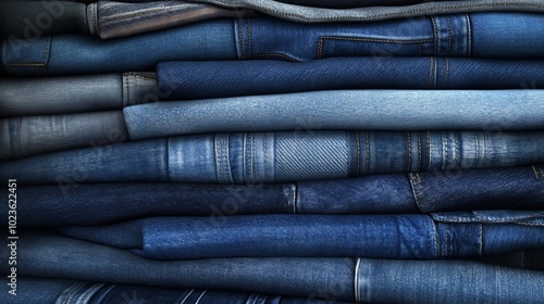 Fashionable jeans neatly folded in layers on a store window, attracting customers.