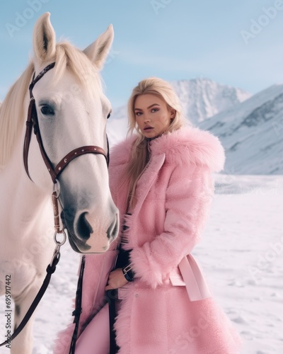 Fashionable woman in a chic pink coat posing with a majestic white horse in a snowy landscape