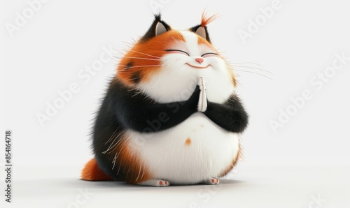 Fat cute fluffy potbellied cat, white orange black fur, funny facial expression, exaggerated movements, praying, 3D character, white background, slightly hairy, elongated shape