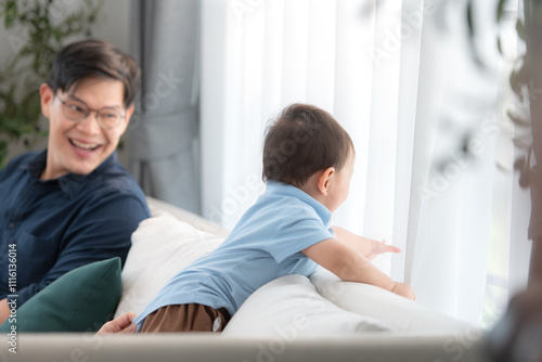 Father and son play together after dad comes home from work