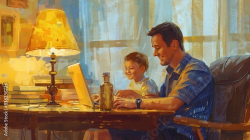Fatherhood and remote business. Happy young single dad working at home while kids plays next to him