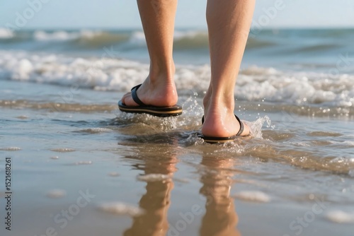 Feet in flip flops walking through shallow beach water, captured from low angle with gentle waves and clear reflections, cinematic and tranquil summer momen