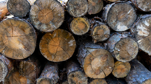 Felled log trees as a material for industry. Rough wooden textures of trees and circular slices of different sizes. The traditional concept of rural fuel.