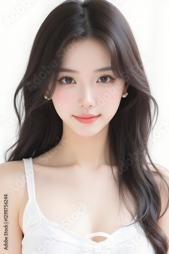 Female Asian Model with Long Hair - Young Beautiful Woman with Wavy Hair - Studio Portrait of Asian Beauty for Fashion, Cosmetic, Skincare - Posing on White Background - Smooth Styled Hair