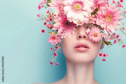 Female beauty portrait with flowers on pastel background modern design.