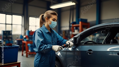 Female car painter, paingting vehicles in auto body shop. Young woman holding spray gun, spraying paint on rim, wearing mask and coveralls.Worker is cleaning a car