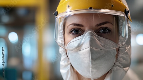 Female chemist in protective gear including helmet and mask, focused expression in laboratory setting, safety protocols in scientific research.