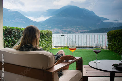 Female Drinking Aperol Spritz and lounging in chair infront of Lake Como in Italy