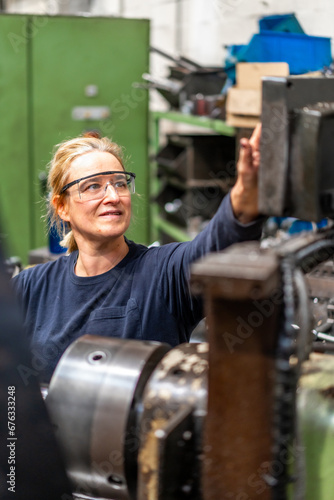 Female factory worker operator working in the control sector on a metal milling machine, industrial factory