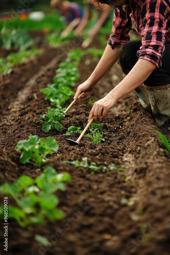 Female farmer planting seeds in a well-tilled garden. Rows of soil and gardening tools are scattered around