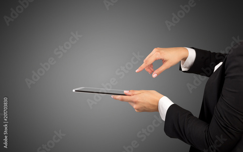 Female hand in suit holding tablet with no wallpaper