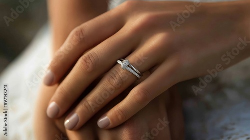 Female hand wearing a diamond engagement ring with soft lighting and natural background