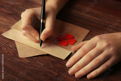 Female hands signing gift card for Valentine's Day on wooden background