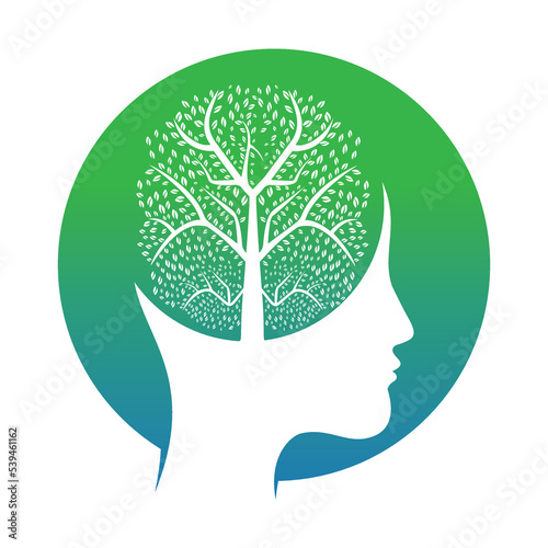 Female head with brain tree logo concept. Organic brain tree mind concept design.