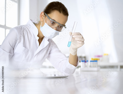 Female laboratory assistant analyzing test tube with blue liquid. Medicine, health care and researching concept
