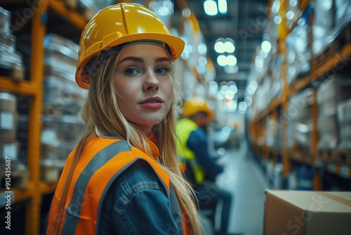 Female Logistics Worker in Warehouse Aisle. Female logistics worker in a hard hat and safety vest, standing in a warehouse aisle filled with shelves and boxes.