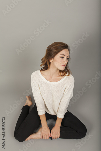 female model sitting showing her neck casual