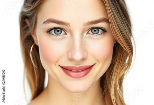 Female portrait, isolated on white background, slight smile, looking directly at the camera.