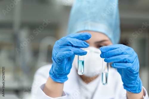 Female scientist looking at the scientific sample in the CDC laboratory