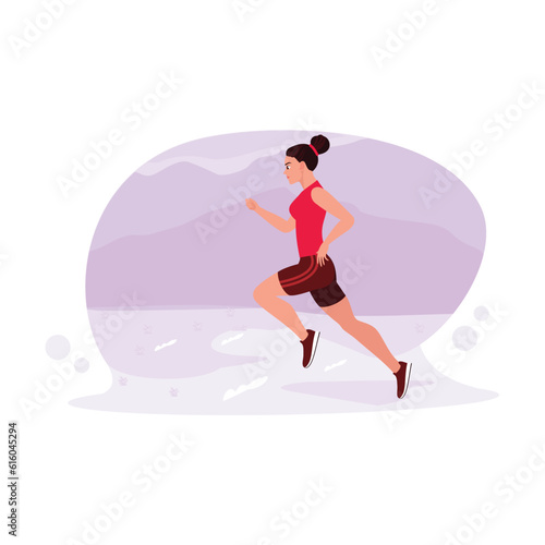 Female sprint athlete running at high speed over the desert. Trend Modern vector flat illustration.
