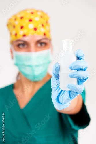 Female surgeon presenting new medicine in white bottle