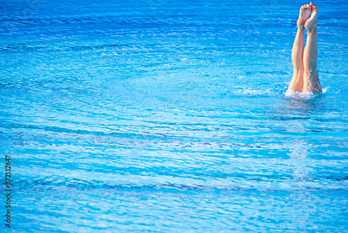 Female swimmer legs point up out of the water in swimming pool. Summer leisure, recreation, holiday, vacation, lifestyle or relax concept with copy space.