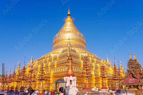 Female tourists make merit and photographing at Shwezigon Pagoda in Bagan, Myanmar.