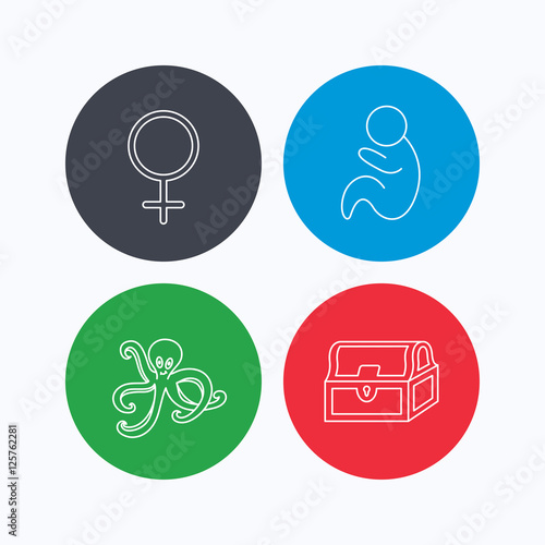 Female, treasure chest and pediatrics icons. Octopus linear sign. Linear icons on colored buttons. Flat web symbols. Vector