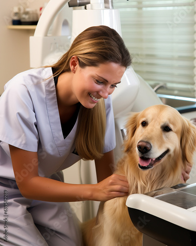 Female veterinarian examining a cute dog at a clinic. Concept of dogs and pets heath and care. Shallow field of view or blurred background.