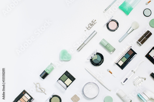 Feminine makeup aqua mente green palette accessories with nail polish manicure tools on white background. Flat lay pattern with copy space, beauty and cosmetics blogger concept banner