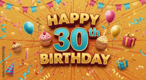 Festive 30th Birthday Celebration with Balloons, Gifts and Sweet Cupcakes in Gold Ambiance Design