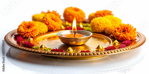 Festive Bhai Dooj Concept: Floating Diya Above Ceremonial Plate Isolated on White Background with Glowing Diya - Elegant Celebration Visual