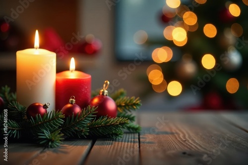 Festive candle, toys & wreath on wood Bokeh background Merry Christmas & Happy New Year , fir, christmas candle