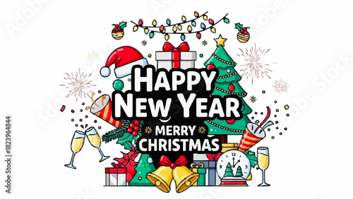 Festive Celebration Image With Christmas Tree, Gifts, Bells, Clock, And Happy New Year Message