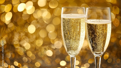 Festive champagne flutes on a glittering gold backdrop, ideal for illustrating celebrations and special occasions