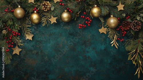 Festive Christmas Border Gold Ornaments Pine Berries Stars