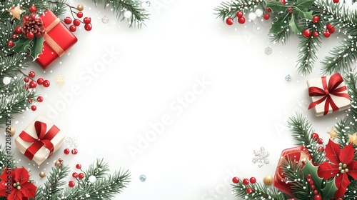 Festive Christmas Border with Gifts, Holly, Pine, and Poinsettias