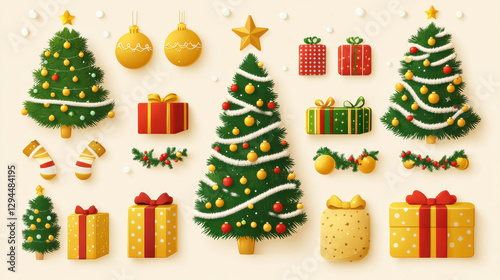 Festive Christmas design elements including trees, gifts, and ornaments create joyful holiday atmosphere