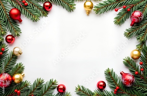 Festive Christmas frame design with fir branches, decorations. Red, gold ornaments adorn green plants border against white backdrop. Ideal for holiday cards invitations as festive background design.
