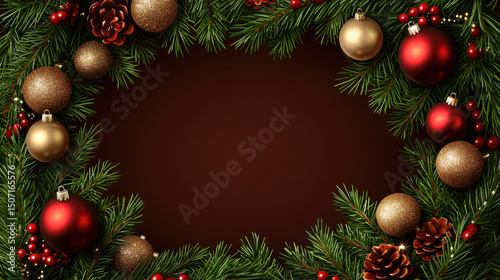 Festive Christmas frame with pine branches, ornaments, and pine cones creating warm atmosphere