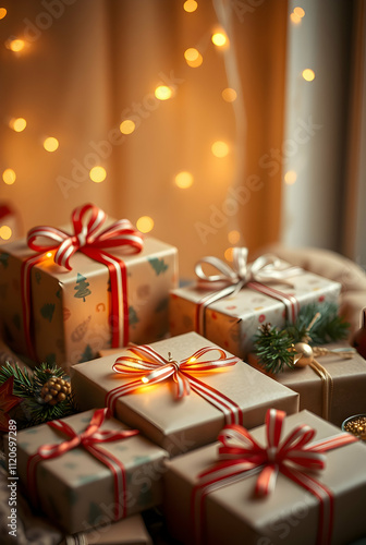 Festive Christmas gifts wrapped in colorful paper with shiny ribbons, arranged under a beautifully decorated tree with twinkling lights, creating a cozy holiday atmosphere. Generated by AI.